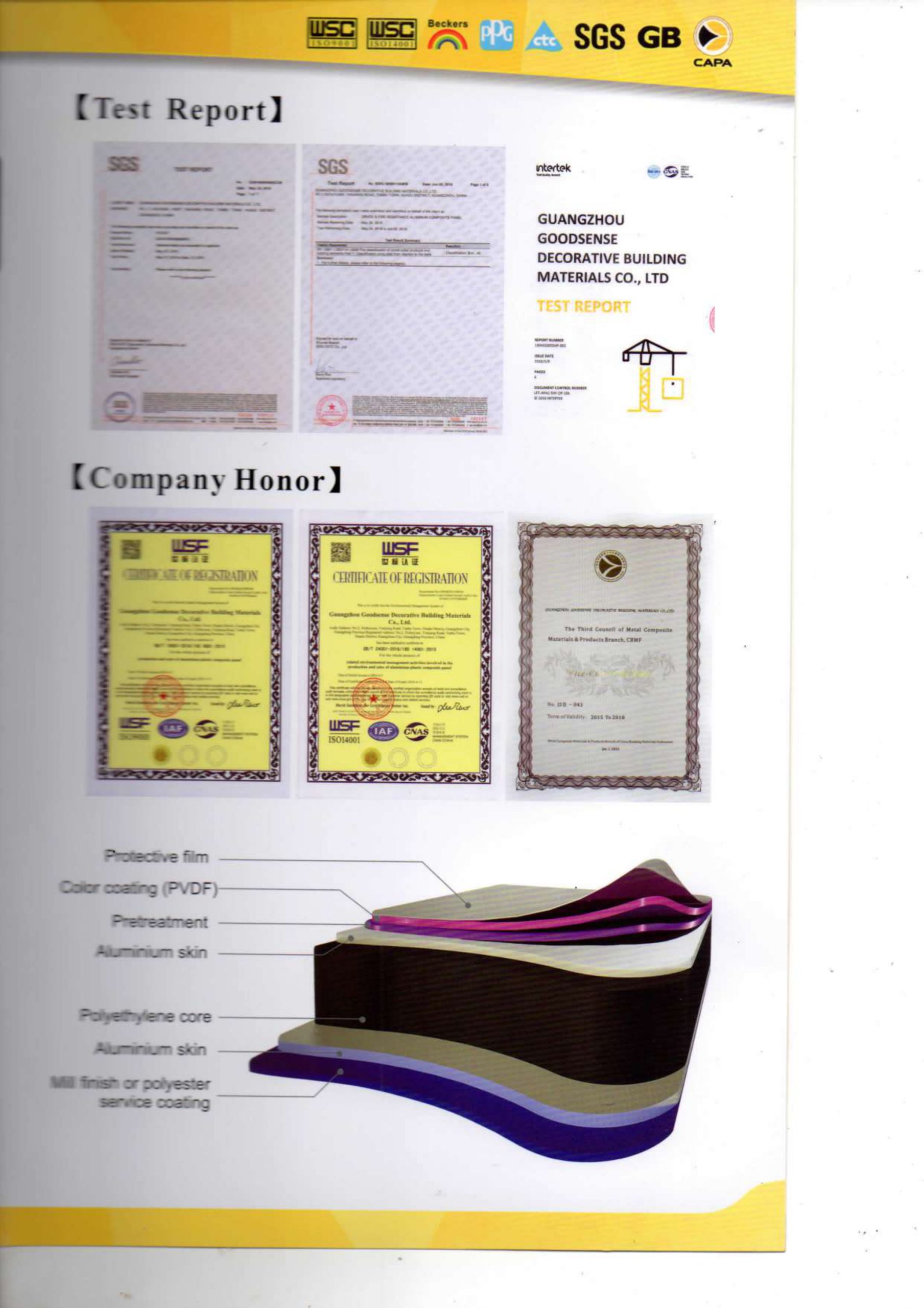 Produk-produk GOODSENSE telah lolos uji Material Testing Center oleh State Construction , dimana Indeks performanya memenuhi standarisasi nasional GT/ T17748-2008, yang telah terdaftar dalam “Recommended Product in Project” and “Green Decoration Aliance Enterprise” di Provinsi Guangdong oleh Kementrian Konstruksi.